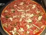 Sin gluten, huevo ni lactosa - pizza de carne picada y aceitunas.