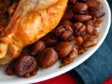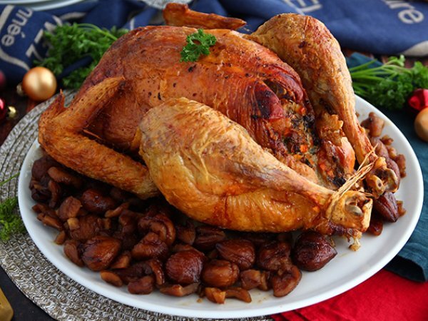 El clásico pavo asado, normalmente acompañado de relleno, salsa de arándanos, puré de patatas y verduras, es un símbolo de las comidas especiales con la familia, en Norteamérica; por ejemplo, es un plato típico de Acción de Gracias y de la Navidad en Norteamérica. Nuestra receta es de capón relleno de castañas. Puedes realizarla con el ave y el relleno que prefieras (siempre y cuando, el peso sea similar al que os mostramos en la receta).