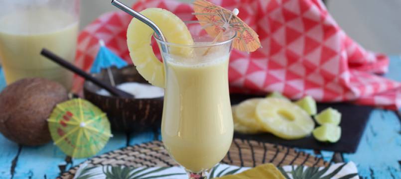 ► Ingredientes: 1 litro de zumo de piña, 200 ml de leche de coco, zumo de 1 lima. Y para la decoración: piña en rodajas (fresca o en almíbar) y cubitos de hielo (opcional)
