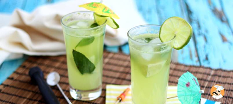 ► Ingredientes: 1 pepino, 1 manojo de menta, 2 limas, 750 ml de gaseosa o agua con gas, 100 ml de sirope de azúcar de caña, hielos