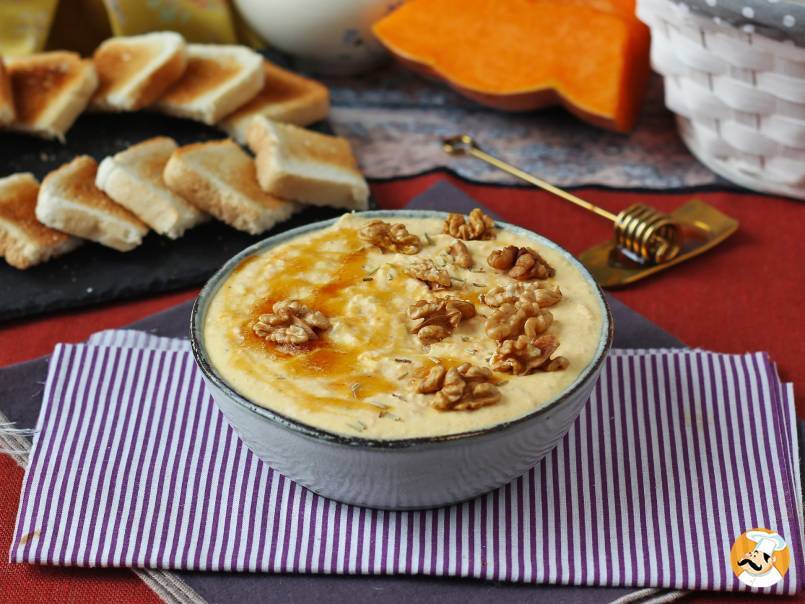La crema untable de calabaza con queso feta y miel es un aperitivo sin gluten muy reconfortante perfecto para la temporada de otoño. El dulzor de la calabaza se mezcla con el sabor del queso feta y la nota seductora de la miel. Una experiencia refinada y sorprendente, perfecta para quienes buscan un toque de originalidad.