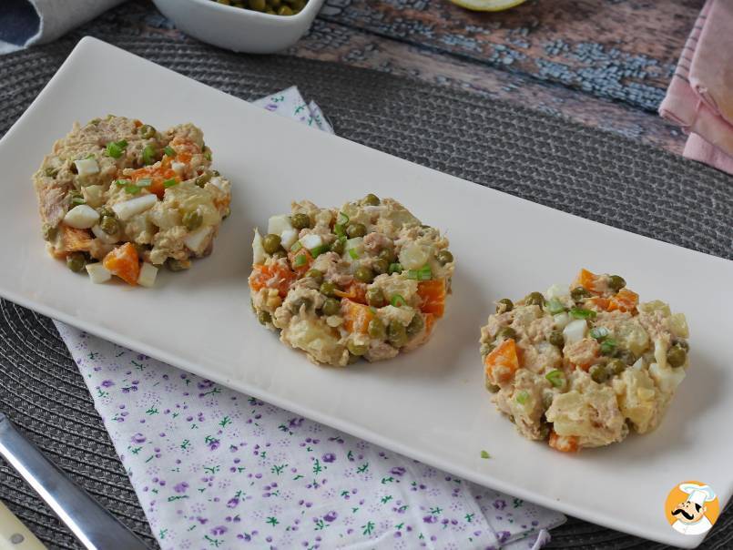La clásica ensaladilla rusa de atún también es ideal para un aperitivo sin gluten. Esta tradicional receta puede servirse en pequeñas porciones para disfrutar de un bocado rico y cremoso.