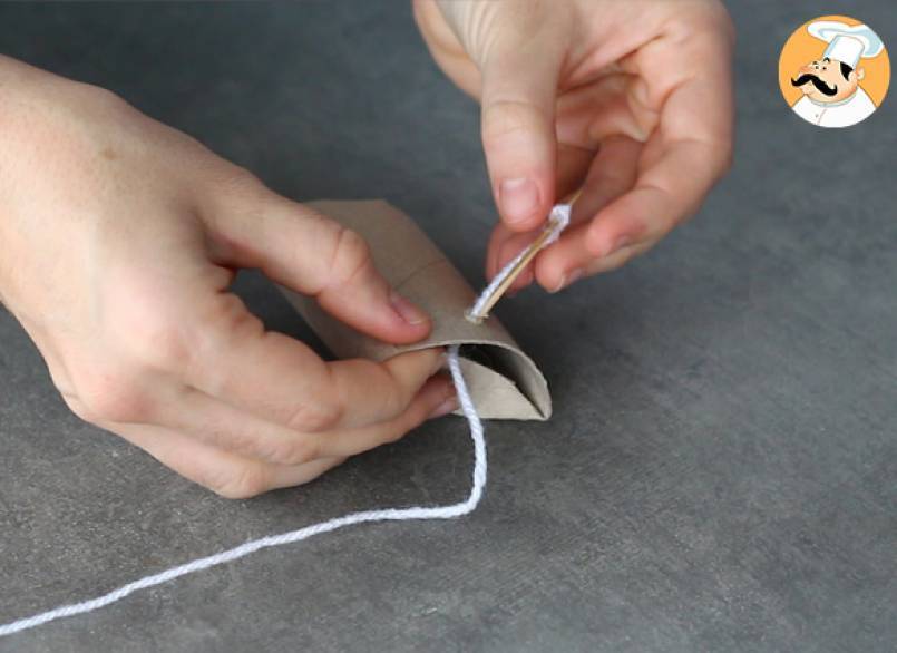 Corta un trozo de cuerda (nosotros hemos usado lana) y pásalo por el agujero.