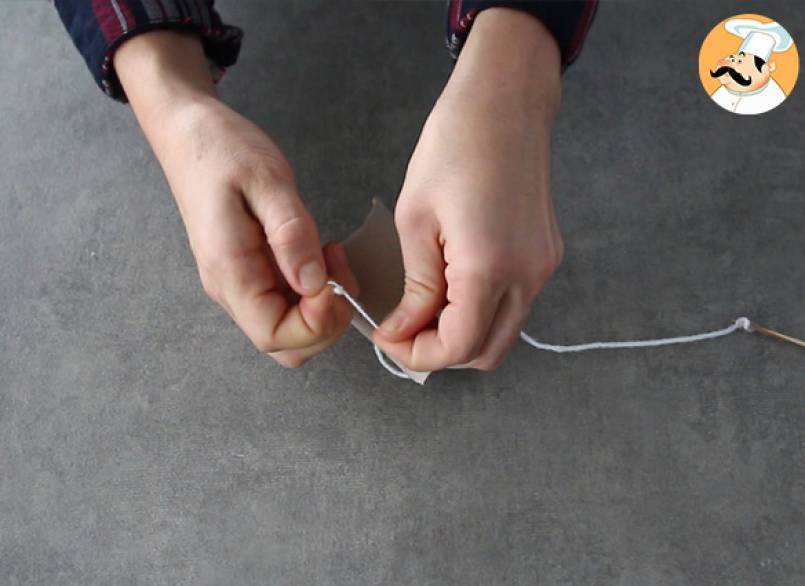 Para hacer más fácil este paso, ayúdate de un palillo de dientes para hacer pasar la cuerda, atando esta al palillo.