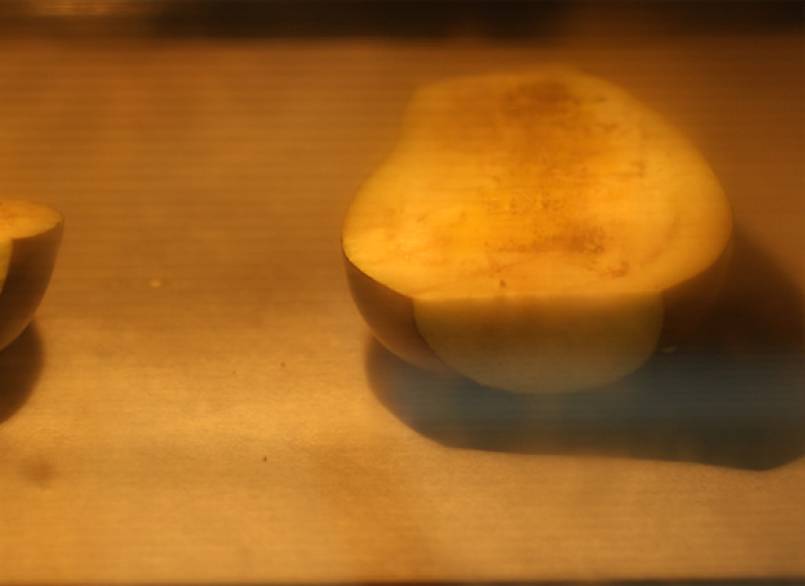 Cortar la berenjena en dos a lo largo. Colocar los trozos, con la piel hacia abajo, en la bandeja de horno, en la que habremos puesto papel sulfurizado. Hacer cortes en la parte superior (como un damero) y pincelar con aceite de oliva.