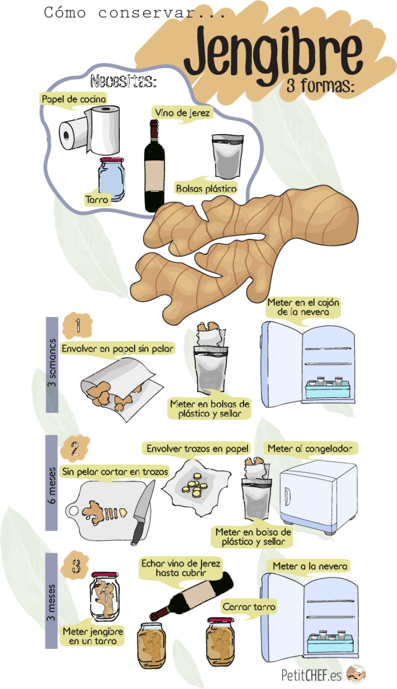 - Para una conservación de máximo 3 semanas, envolveremos el jengibre en una servilleta de cocina, la meteremos en una bolsa de plástico y lo guardaremos en el cajón para las verduras de la nevera.