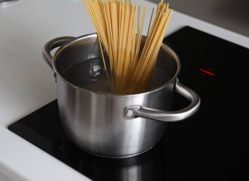 Poner agua y sal en la olla. En cuanto hierva, empezar a cocer la pasta.