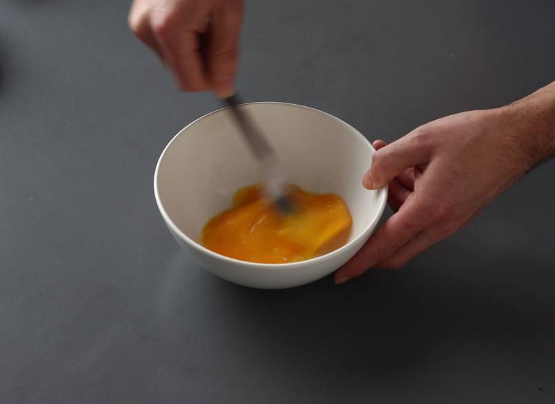 Poner un huevo entero y una yema en un bol. Batir todo como si fuera una tortilla.