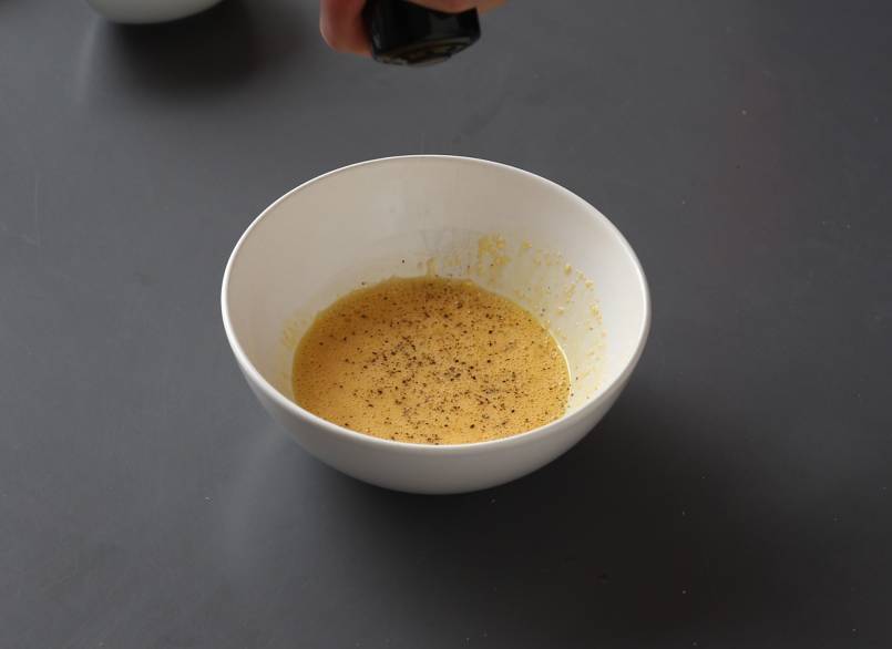 En el bol con los huevos, añadir un poco de la grasa que suelta el guanciale. Añadir poco a poco la pimienta molida y el queso. Mezclar hasta que quede cremoso.