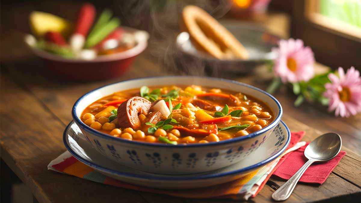 El cocido madrileño sigue siendo el plato estrella de las recetas de San Isidro. Esta preparación generosa reúne garbanzos, embutidos, tocino, morcillo, puntas de jamón, hueso de rodilla de ternera, gallina, repollo, zanahorias y fideos en una armonía de sabores servida en tres vuelcos distintos.