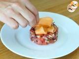 Corta la rodaja de melón en tiras muy finas y colócalas sobre el tartar a modo de decoración. Y ya está listo para servir. Si no lo vas a consumir de inmediato guárdalo en la nevera porque este tartar fresquito está más bueno ;-)