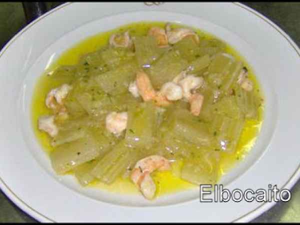 Pencas de cardo en salsa verde con langostinos (martin serna)