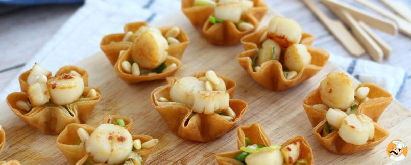 Para un aperitivo de bocado más refinado y elegante te tentamos con este crujiente de vieiras. La mezcla de texturas y sabores es realmente remarcable. Para hacerlo usaremos una base crujiente de masa brick y un relleno de puerros, vieiras, piñones y limón. ¡Realmente delicioso!