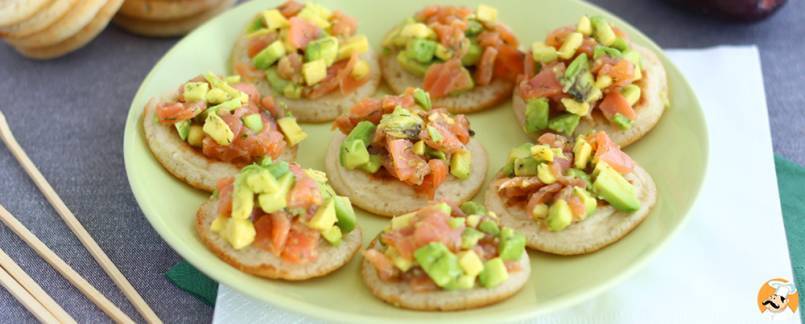 Para la guarnición… ¡Las opciones son ilimitadas! ¿queso de cabra y cebolla caramelizada? Bacon queso? ¿tomate con jamón? Estas de salmón y guacamole son una combinación ganadora en cualquier ocasión.