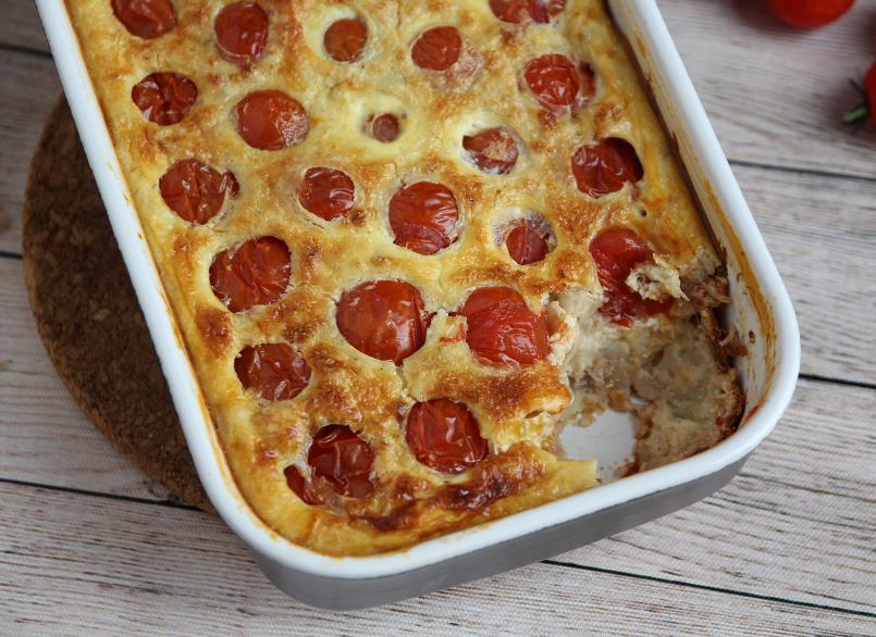 Jugoso, suave y con un toque mediterráneo, este clafoutis es perfecto para una comida práctica y deliciosa. Solo necesitas mezclar huevos, un poco de harina, leche, atún en lata y tomates cherry. Al horno… ¡y listo! El resultado es una textura ligera entre flan y tarta, ideal para llevar en un tupper.