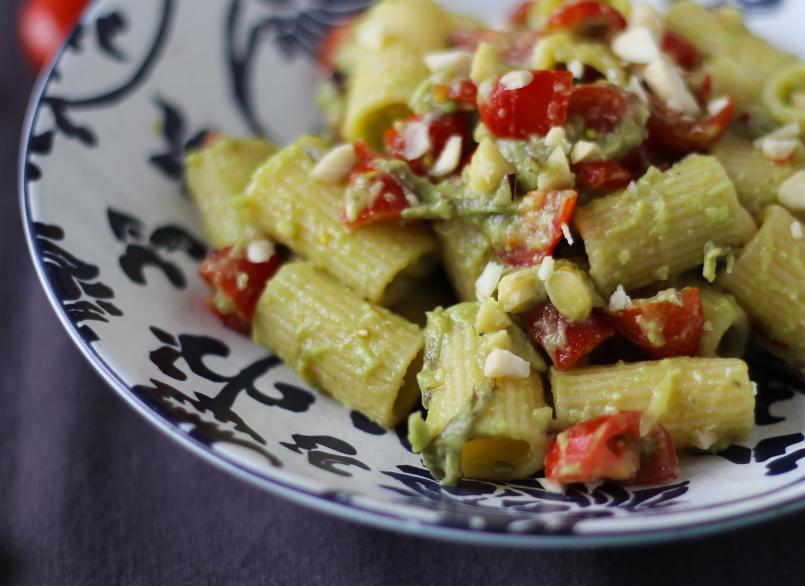 3. Ensalada de pasta con crema de aguacate, almendras y tomates cherry