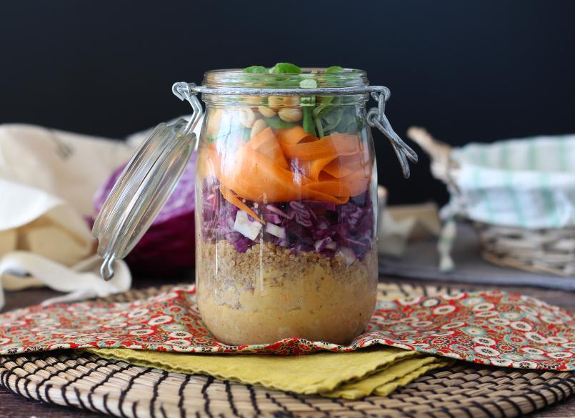 Práctica, vistosa y muy cómoda de llevar. Solo tienes que colocar en un tarro de cristal capas de garbanzos, quinoa, verduras crudas de colores, una vinagreta en el fondo (para que no humedezca el resto) y un toque de queso o semillas para darle más textura. Se prepara con antelación y, antes de comer, solo hay que agitar.