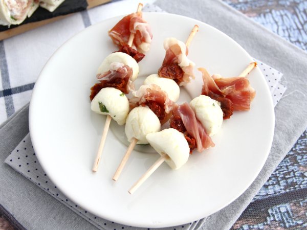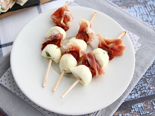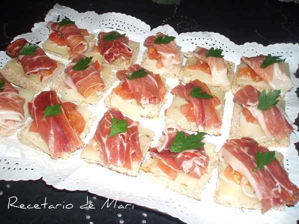 Mini montaditos de queso manghego, jamón serrano y tomate