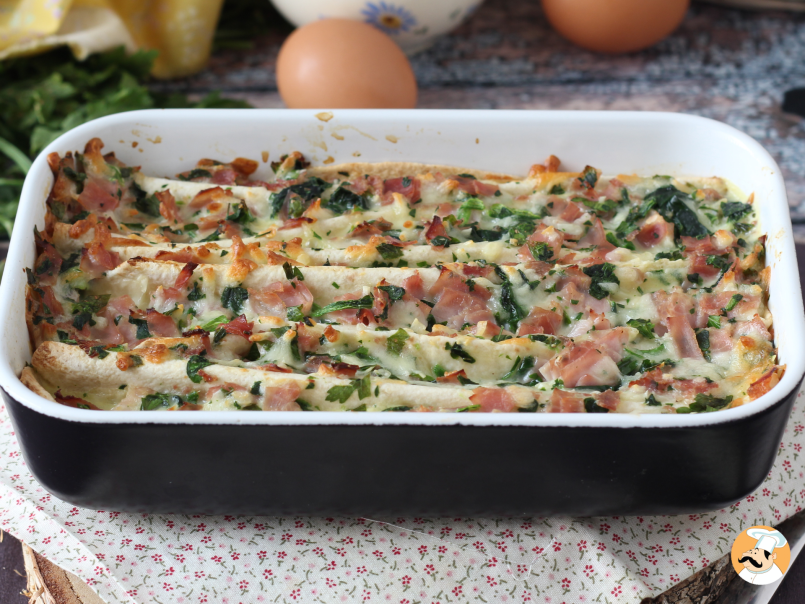 ► Preparación: Mezclar los huevos, la leche, la sal y la pimienta. Añadir las espinacas, el jamón picado, la mozzarella rallada y el perejil fresco picado (al gusto). Doblar las tortillas en forma de acordeón. Colocar las tortillas dobladas una al lado de la otra en la fuente para gratinar. Verter la mezcla de jamón por encima. Presionar el relleno en los espacios entre las tortillas. Hornear durante 20 minutos a 180°C. ¡Y listo!