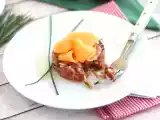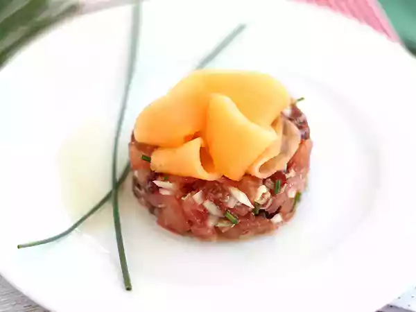 Como evolución de esta simple asociación de jamón y melón surgen recetas más elaboradas en la que se combinan otros ingredientes. Así ocurre con este tartar que aliñamos con una rica vinagreta y a la que añadimos tomate y cebolla. No dudes en servirlo en cucharitas, vasitos pequeños o incluso servido en pequeñas tostas de pan para conseguir un aperitivo de bocado sensacional.