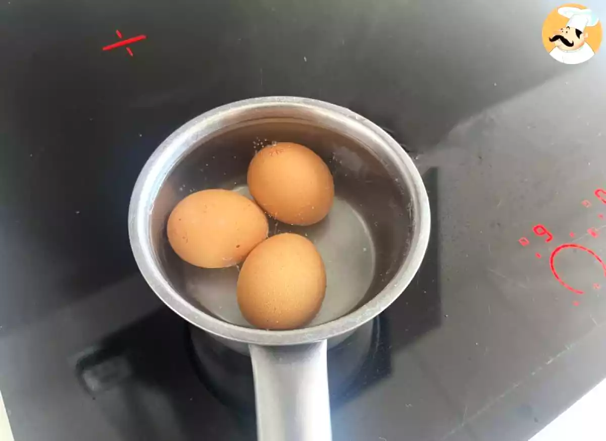 Pon a hervir agua en una olla grande. Cuando el agua esté hirviendo, introduce los huevos y déjalos cocer durante 10 minutos. Una vez cocidos, quítales la cáscara.