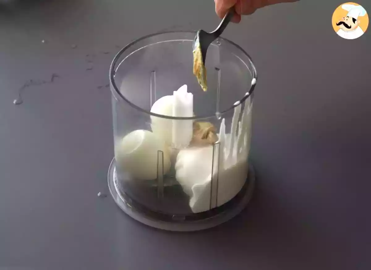 En una licuadora o batidora deposita los huevos duros, la mostaza, el yogur griego, el vinagre de vino, la sal y la pimienta.