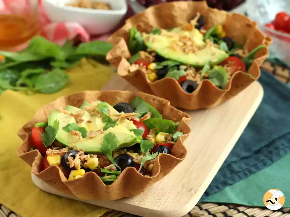¡Tus ensaladas no volverán a ser lo mismo con esta presentación! Prepara unas sorprendentes cestas usando las tortillas de trigo. Para hacerlas necesitarás el típico molde para hacer flan con forma de tulipa. Dentro colocaremos las tortitas, luego una rápida pasada por el horno y ya lo tendremos. Un simpático bowl que podemos rellenar de los ingredientes que más nos gusten. Fácil, rico y de lo más original.