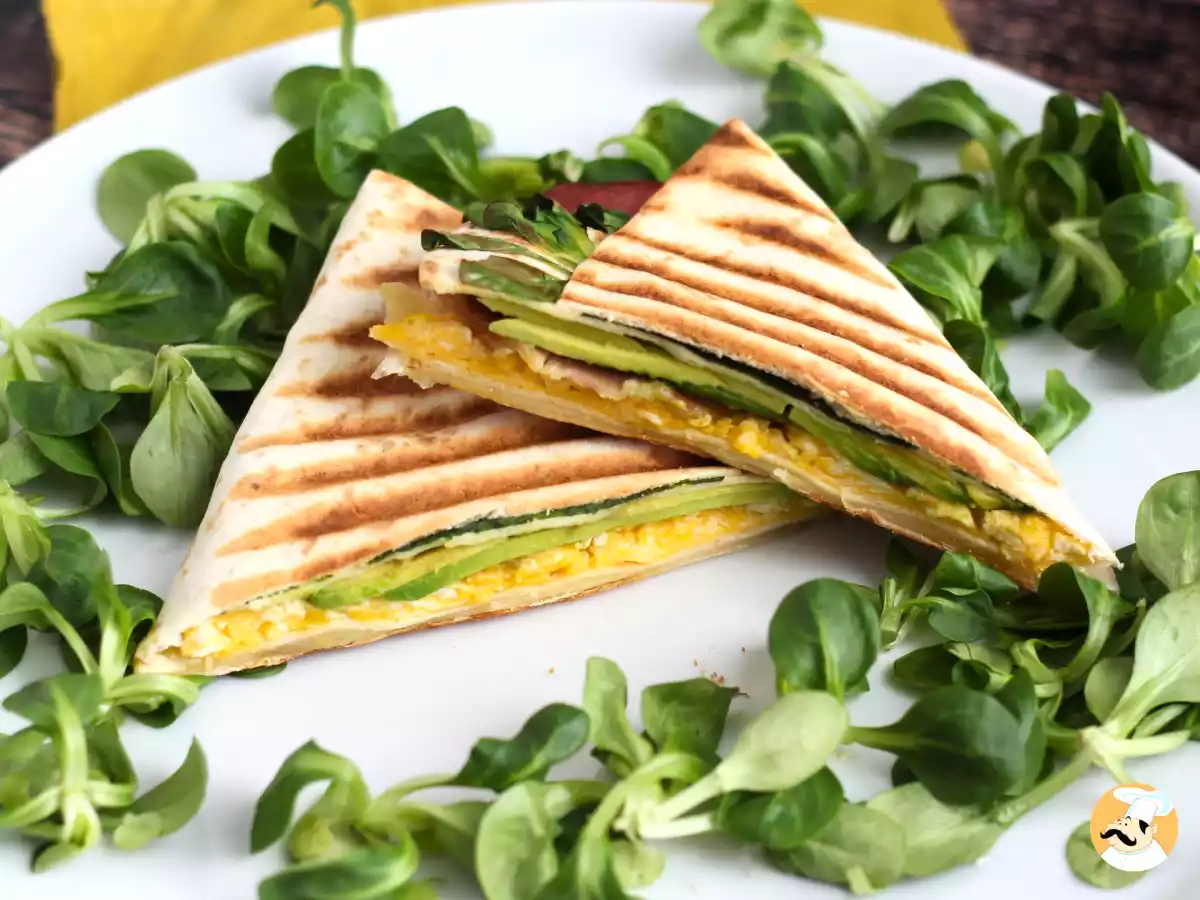 Coloca la parte que tiene el corte hacia abajo, (esto nos facilitará el plegado). Ahora, ve colocando los diferentes ingredientes en cada uno de los cuartos de la tortilla. Ahora solo falta ir plegando y replegando la tortilla sobre sí misma. Puedes tostar la tortilla wrap en una sándwichera hasta que el exterior esté dorado. Si no tienes sándwichera puedes hacerlo en una sartén engrasada con un poco de mantequilla. Y listo!