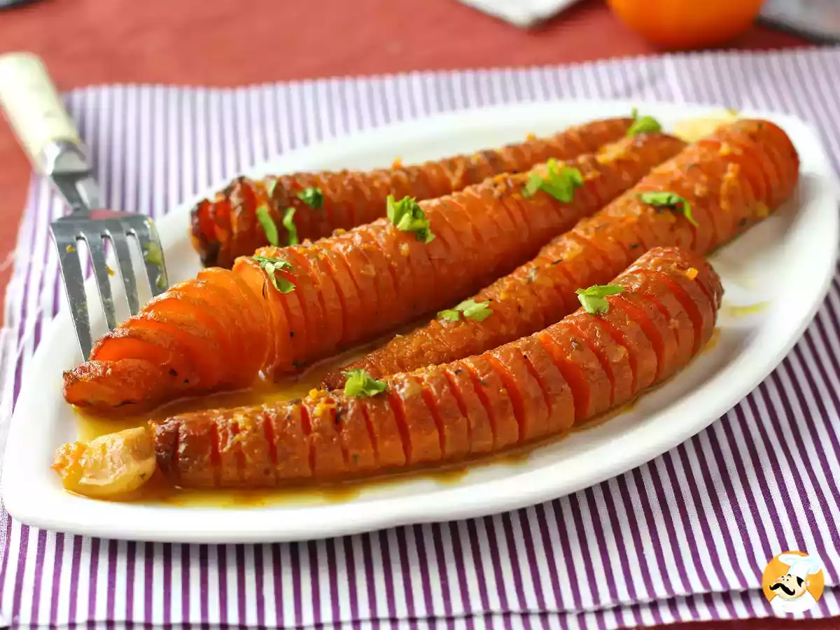 Para conseguir crear un efecto en acordeón, aplicaremos la técnica hasselback. Esto se logra realizando cortes finos y paralelos en las zanahorias, sin llegar al fondo. Coloca cada zanahoria entre dos tablas de madera o cucharas para evitar cortar completamente. Repite este procedimiento con todas las zanahorias.