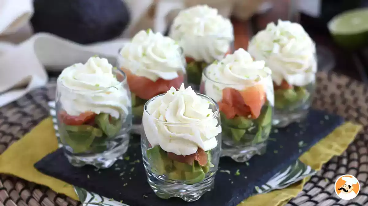 En cuanto a la combinación de sabores, hemos optado por combinar dos ingredientes que nos gustan especialmente: el salmón ahumado y el aguacate. Y para coronar nuestros vasitos hemos preparado una crema salada con ligero toque cítrico que serviremos con una manga pastelera para que quede más estético.