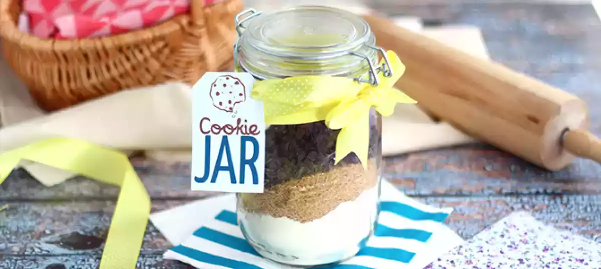 Aunque en otros países es muy usual este regalo, en España no es el caso. El "Cookie Jar" se trata de bonito tarro de cristal con todos los ingredientes secos necesarios para la preparación de unas galletas. El tarro va acompañado con una etiqueta en la que se explica la receta y los ingredientes frescos que hay que sumarle como pueden ser los huevos y la mantequilla. Podréis hacer junt@s la receta y compartir un divertido rato.