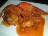 Ingredientes: Un pollo 2 o 3 langostinos por persona Una cebolla mediana 6 cucharadas de tomate triturado Una copa de coñac 2 vasos de caldo de pescado Aceite y...
