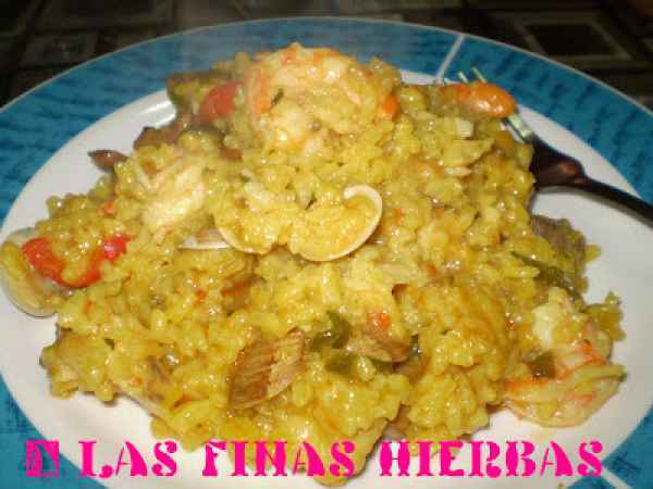 Arroz con pescado, gambas y setas