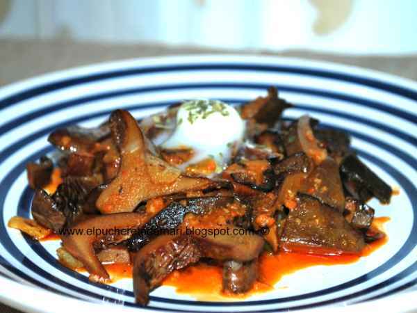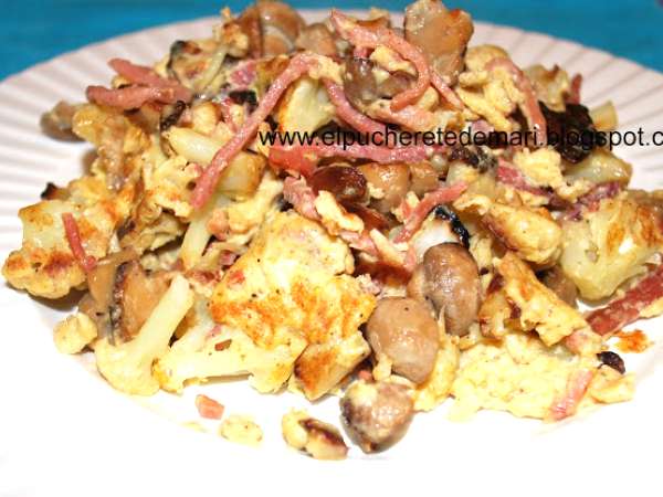 Revuelto de coliflor, champiñones e hilos de jamón curado