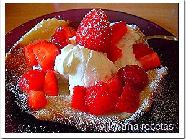 Cesta de galleta con helado de nata y fresas