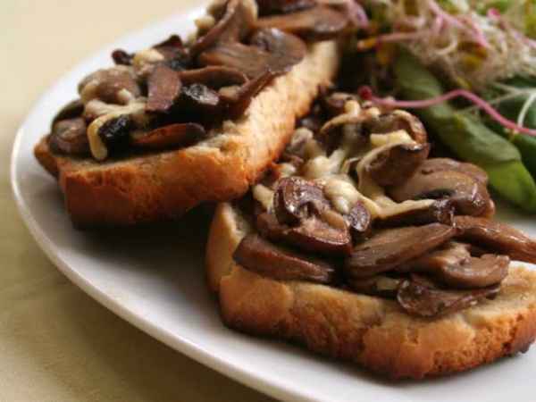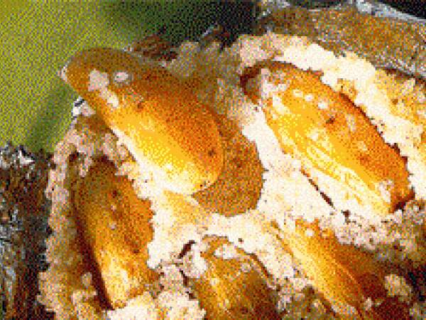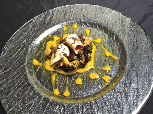 Patatas a la importancia rellenas de torta del casar en salsa de setas y trufa
