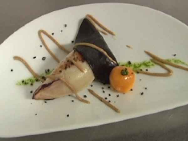 Chipirones rellenos de patata asada, pimiento verde y jamón