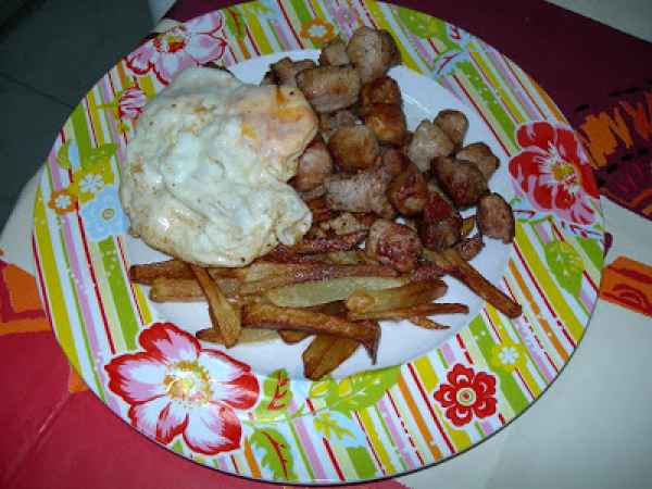 Raxo de cerdo con patatas fritas y huevo