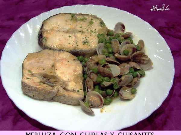 Merluza con chirlas y guisantes