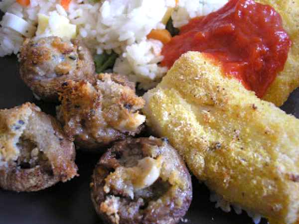 Pescado empanado con champiñones rellenos en horno turboconvección