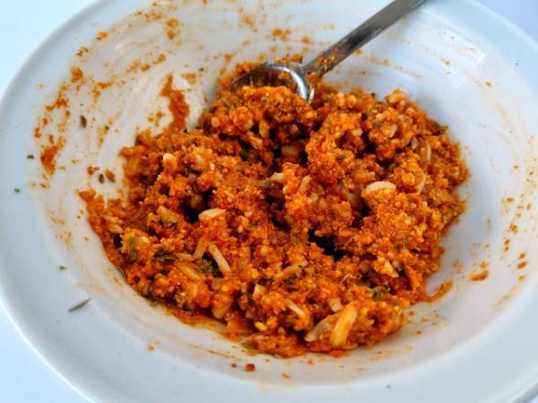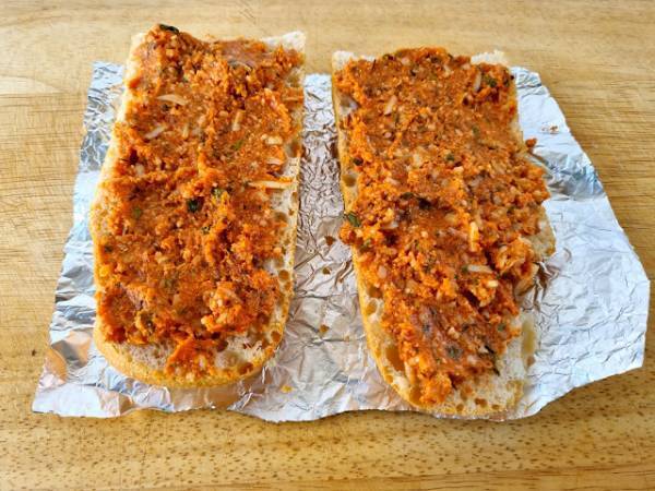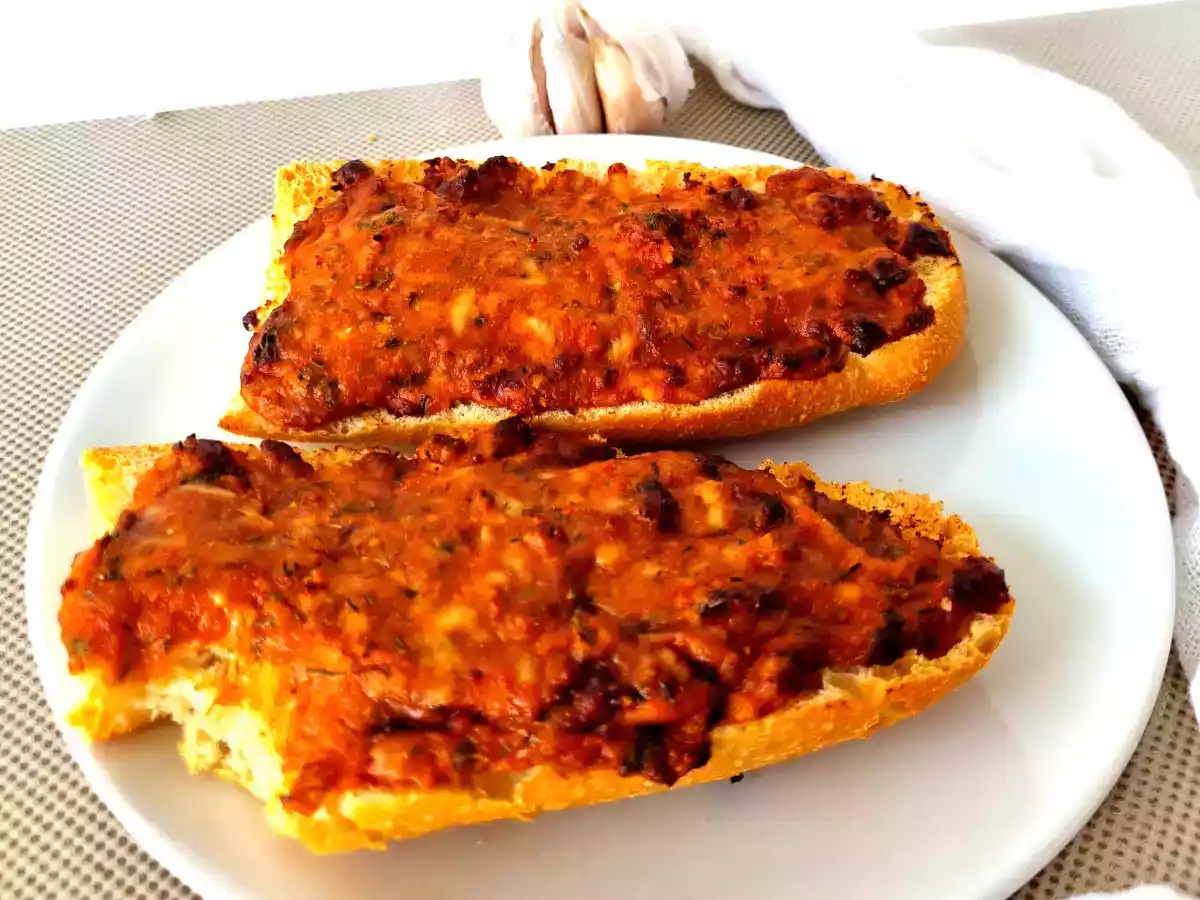 1 pan de baguette 1 cucharada de mantequilla 6 cucharadas de tomate frito 120 queso rallado light Perejil fresco picado 1 diente de ajo triturado con el prensa ajos 1/2 cucharadita de sal 1/2 cucharadita de pimienta negra 1/2 cucharadita de pimentón dulce