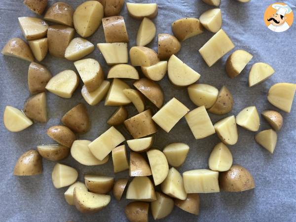 Coloca las patatas en una bandeja para hornear forrada con papel sulfurizado. Hornéalas a 180°C durante unos 30-40 minutos, o hasta que estén doradas y crujientes por fuera y tiernas por dentro.