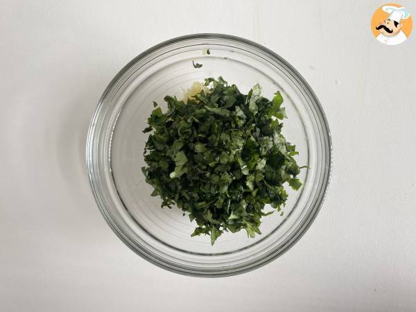 En un bol pequeño, mezcla el perejil picado, el ajo picado, el orégano seco y el pimiento de cayena picado finamente.