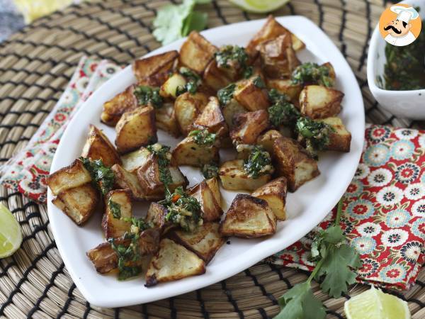 Una vez que las patatas estén listas, sácalas del horno y déjalas reposar unos minutos. Ahora, solo queda servir las patatas con el chimichurri. Puedes verter el chimichurri sobre las patatas o servirlo aparte para que cada uno ajuste la cantidad a su gusto. ¡Buen provecho!