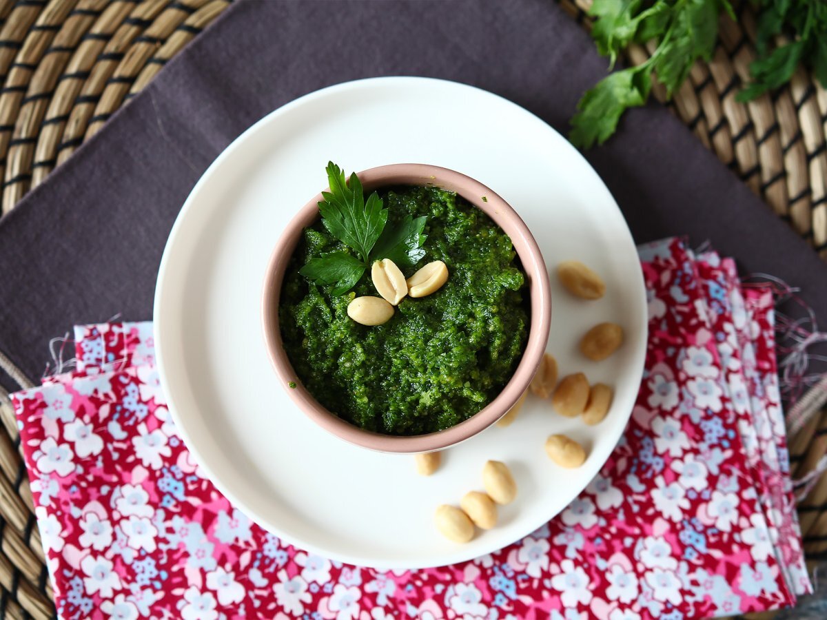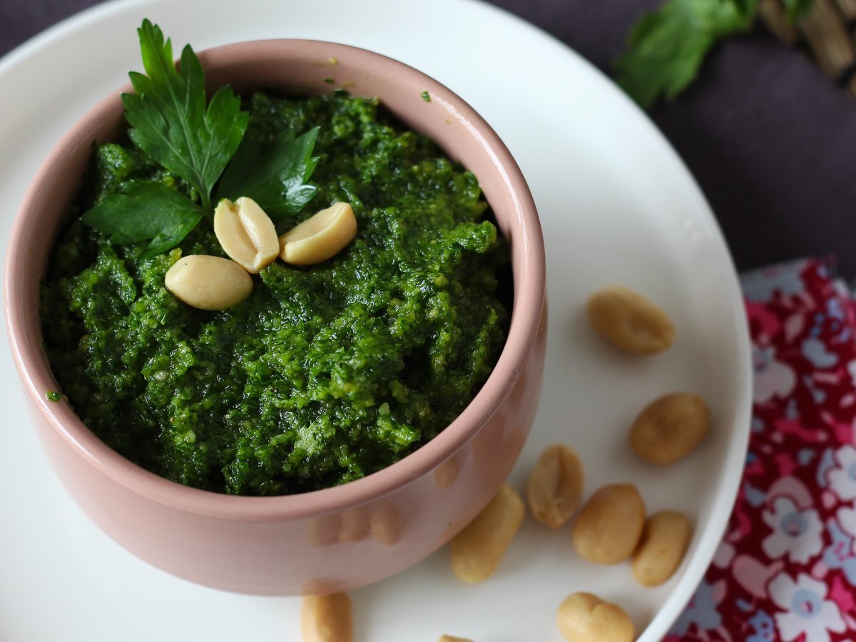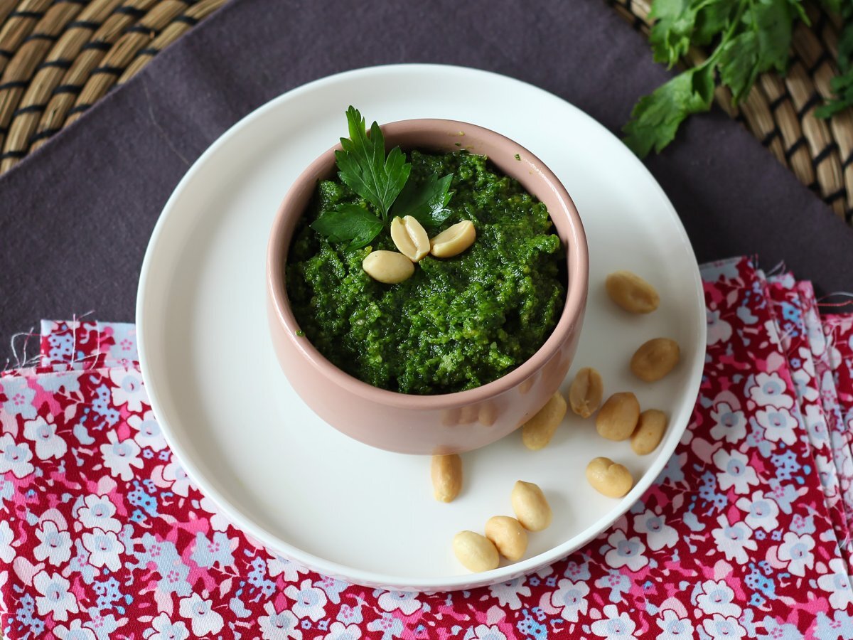 En la categoría de salsas originales para nuestros platos de pasta estaría este delicioso y original pesto de perejil y cacahuetes. Y sí, porque aunque nos parezca sorprendente, no es mandatorio utilizar albahaca para preparar la tradicional salsa italiana. Ni tampoco piñones que, en este caso, sustituiremos por unos crujientes cacahuetes. Variaciones que nos permiten variar del tradicional pesto verde alla genovesa. No lo dudes y dale una nueva oportunidad a esta nueva asociación de sabores y prueba hoy mismo esta salsa que no necesita cocción y que es perfecta para acompañar nuestros platos de pasta, para alegrar un sándwich o para untar una tosta o bruschetta.