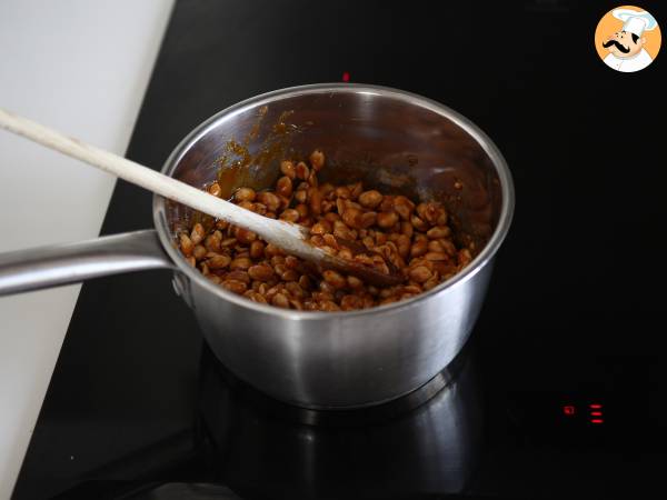 Cuando se forme el caramelo, añadir los cacahuetes (no es necesario dejarlos enfriar) e incorporar bien.