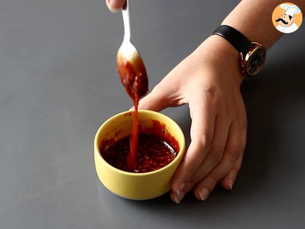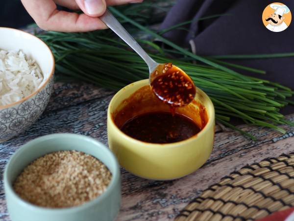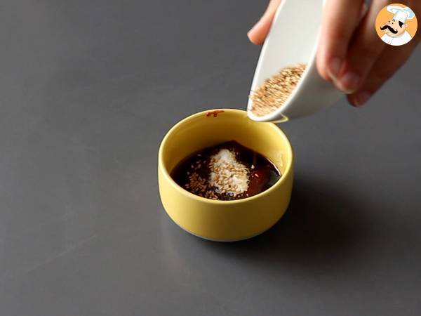 Agregar en un bol: 1 cucharada de gochujang + el azúcar blanco + la salsa de soja + el aceite de sésamo + las semillas de sésamo.