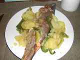Ingredientes: 1 trucha asalmonada de tamaño mediano/grande ya limpia. 1 patata grande. 1 pimiento verde italiano. 1/2 cebolla. 1 loncha de jamón serrano el zumo...