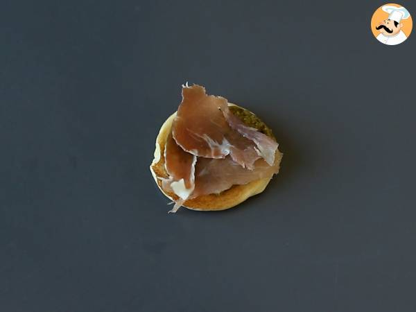 Untar los blinis con una o dos cucharaditas de salsa de pesto verde. Cortar la loncha de jamón de Parma en trozos pequeños y colocar sobre el pesto.