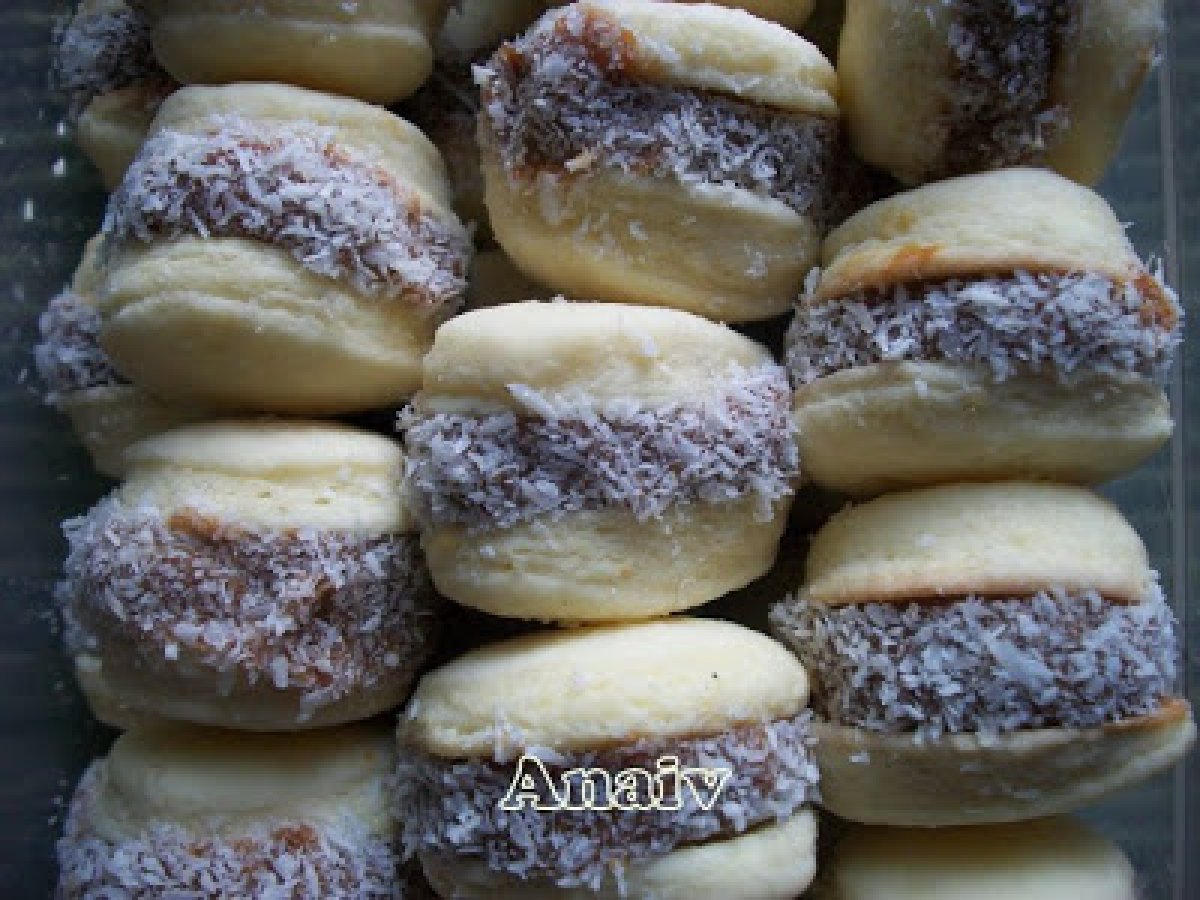 - Untar la mitad de las tapas con dulce de leche repostero y cubrir con las tapas restantes. Pasar los bordes por coco rallado y servir.